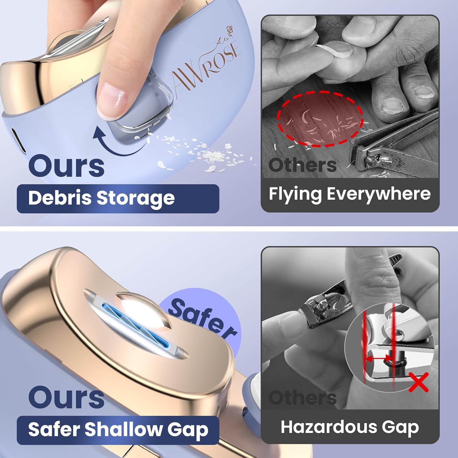 NAIL CLIPPING ORGANIZER: The electric nail clipper is equipped with a nail clipping organizer, you no longer have to worry about nail chips flying everywhere and you no longer need to clean the place after cutting your nails.